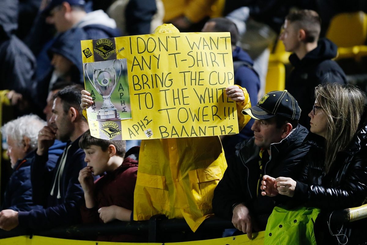 Συγκεκριμένα, ο φωτογραφικός φακός τον συνέλαβε στο Κλεάνθης Βικελίδης στο ματς απέναντι στον Βόλο να κρατάει ένα πλακάτ, το οποίο έγραφε: “Δεν θέλω κάποια φανέλα, φέρτε το Κύπελλο στον Λευκό Πύργο”.