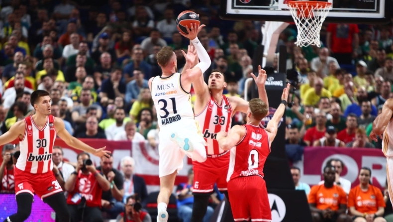 Η Ρεάλ Μαδρίτης χάρη στην εντυπωσιακή της απόδοση στο πρώτο ημίχρονο κόντρα στον Ολυμπιακό, επικράτησε άνετα με 87-76 και πήρε το εισιτήριο για τον τελικό της Κυριακής κόντρα στον Παναθηναϊκό (26/05, 21:00). Οι «ερυθρόλευκοι» έπαιξαν το γνωστό τους καλό μπάσκετ μόνο στο δεύτερο ημίχρονο, αλλά αν και μετρ των ανατροπών αυτή τη φορά δεν τα κατάφερε και έτσι παρά την προσπάθεια να γυρίσουν το ματς, θα ετοιμαστούν για τον άχαρο μικρό τελικό με τη Φενέρμπαχτσε