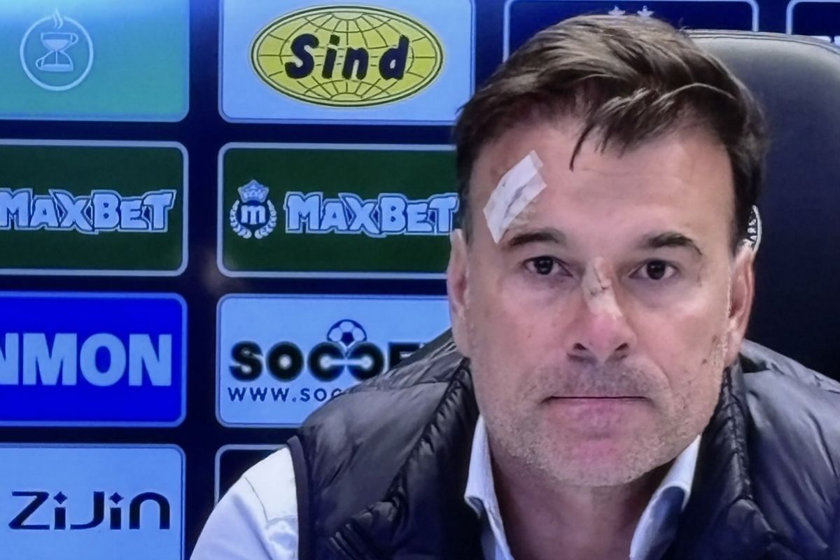 Ο πρώην προπονητής του ΠΑΟΚ εμφανίστηκε με τσιρότο στο μέτωπο στη συνέντευξη Τύπου και ανέφερε: “Έσπασαν ένα τζάμι και με χτύπησε. Δεν υπήρξε κάποια μάχη σώμα με σώμα. Το τζάμι έσπασε και υπήρξε αίμα. Είναι λίγο ντροπιαστικό, δεν ήρθα εδώ να το κάνω θέμα”.