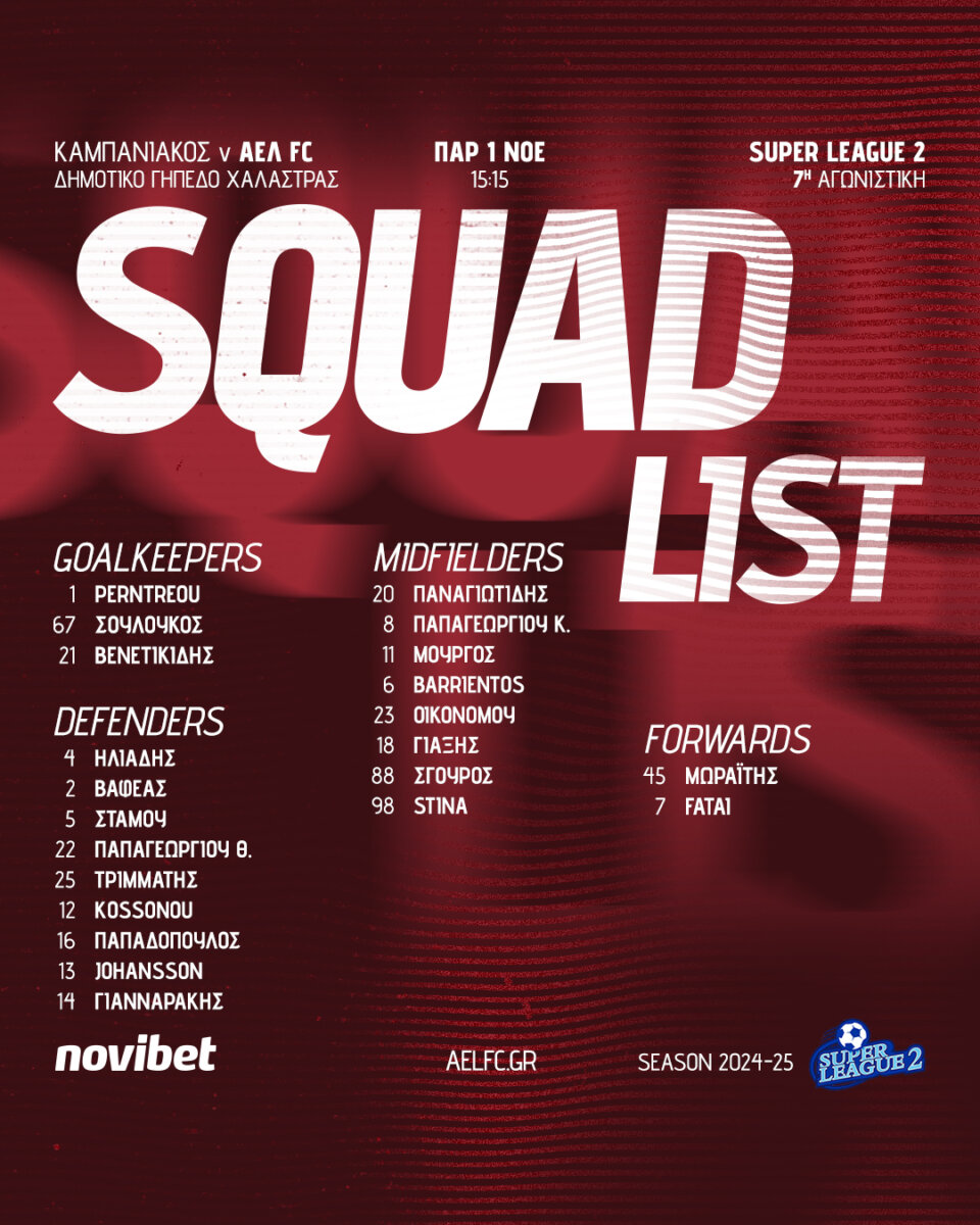 Mε στόχο το τρίποντο που θα την διατηρήσει στην κορυφή του βαθμολογικού πίνακα, η ΑΕΛ αγωνίζεται την Παρασκευή στην Χαλάστρα με τον Καμπανιακό για την 7η αγωνιστική της Super League 2.