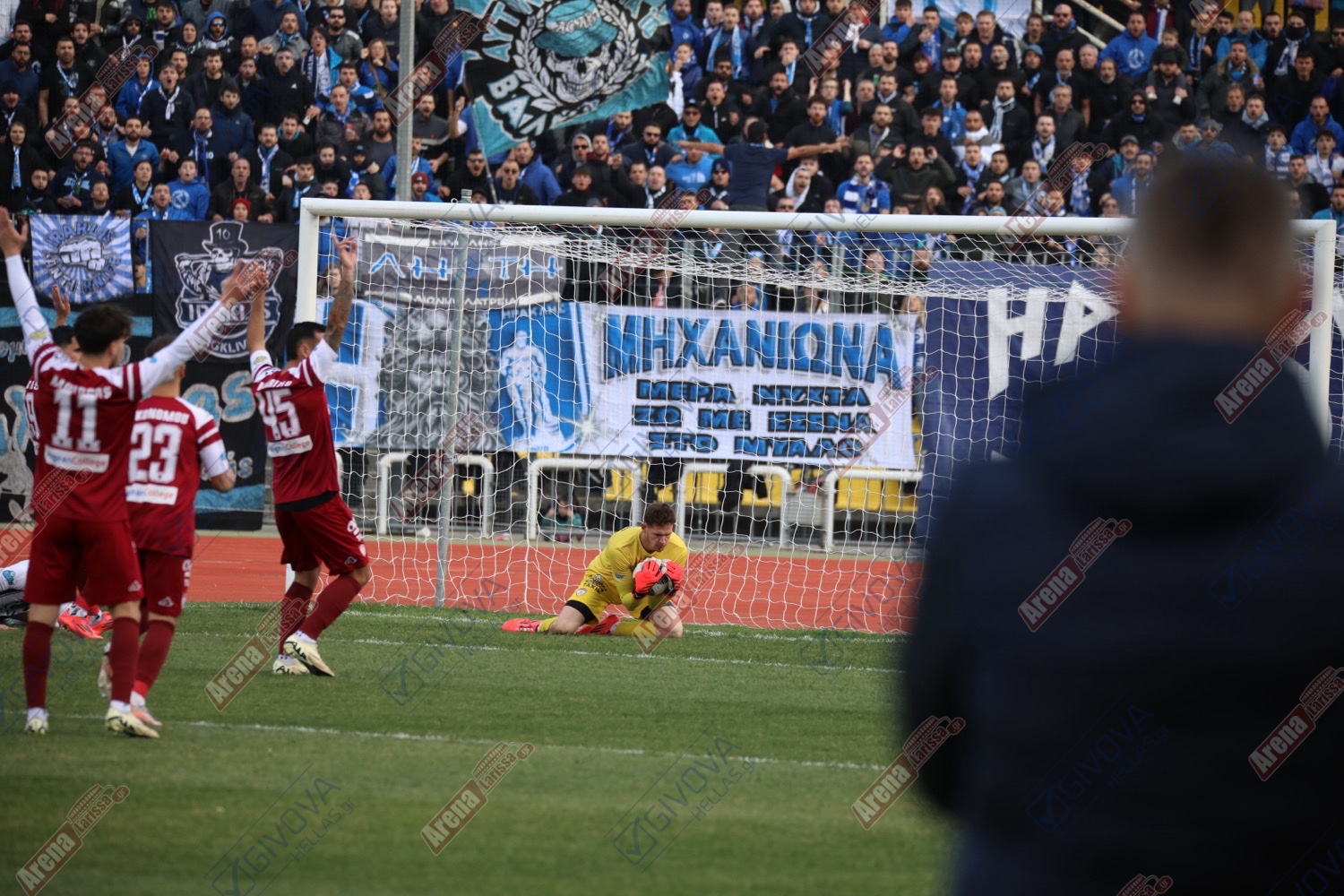 Πέντε λεπτά αργότερα οι “βυσσινί” γύρισαν πολύ ωραία την μπάλα με αυτή να καταλήγει στον Κρητικό μέσα στην περιοχή σε πλάγια θέση, ο Λαρισαίος επιθετικός έκανε την συρτή σέντρα και ο κίπερ των γηπεδούχων βγήκε σωτήρια και μπλόκαρε την μπάλα προ του Πασά.
