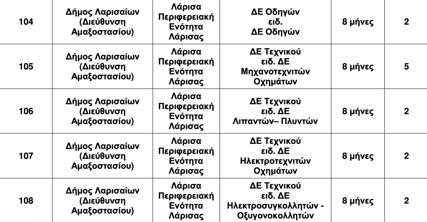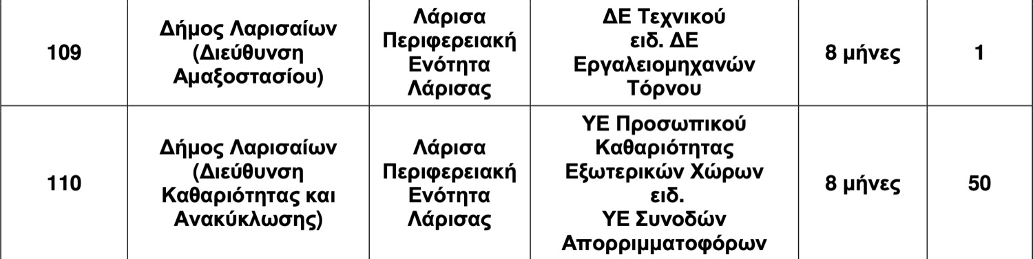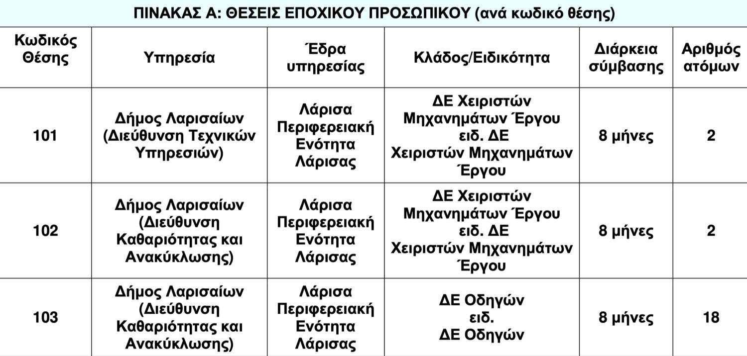 Ο Δήμος Λαρισαίων προχωράει στην πρόσληψη, με σύμβαση εργασίας ιδιωτικού δικαίου ορισμένου χρόνου, συνολικά ογδόντα έξι (86) ατόμων ηλικίας από 18 έως 67 ετών για την κάλυψη αναγκών ανταποδοτικού χαρακτήρα στο Δήμο Λαρισαίων, που εδρεύει στη Λάρισα της Περιφερειακής Ενότητας Λάρισας, και συγκεκριμένα του εξής, ανά υπηρεσία, έδρα, ειδικότητα και διάρκεια σύμβασης, αριθμού ατόμων: