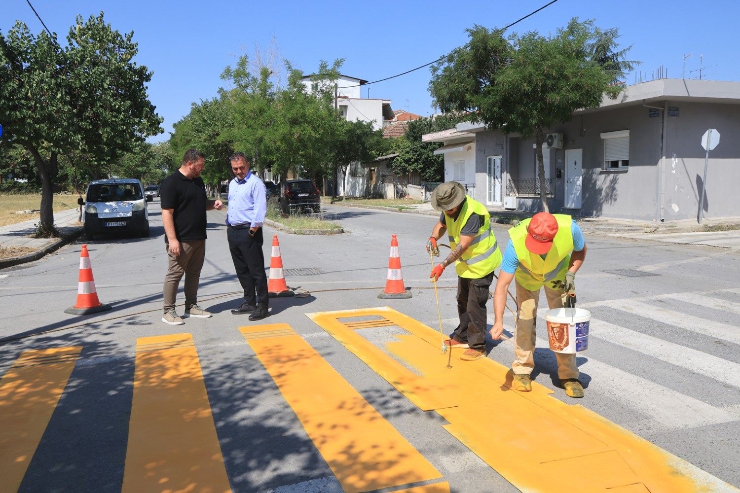 Να σημειωθεί ότι οι εργασίες πραγματοποιούνται ήδη από την περασμένη Παρασκευή, ενώ σήμερα το πρωί, ο Δήμαρχος Λαρισαίων, κ.Θανάσης Μαμάκος και ο Αντιδήμαρχος Κυκλοφοριακών Παρεμβάσεων, κ.Ευάγγελος Παπαλέξης, μετέβησαν στο 21ο Δημοτικό Σχολείο, στη συνοικία της Νεάπολης, ένα από τα σχολεία όπου οι διαβάσεις πεζών άλλαξαν… χρώμα.